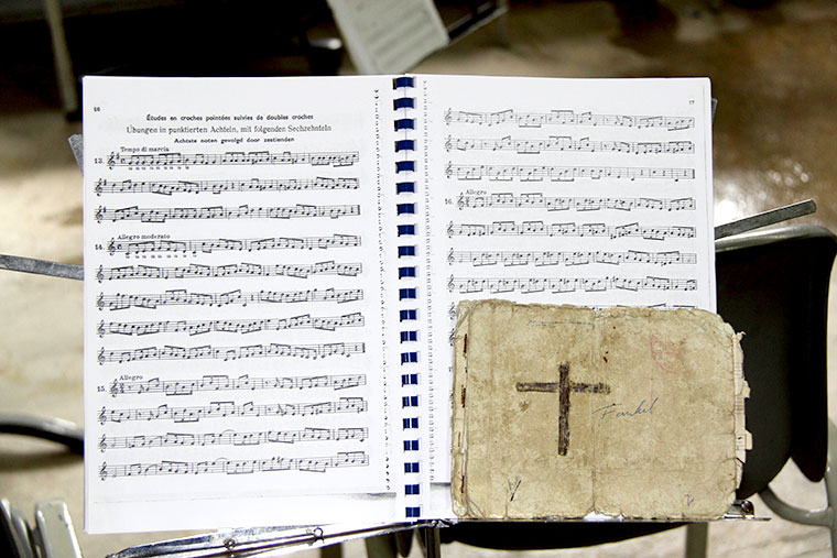 De politiekapel naar een begrafenis (l) en een kapellid repeteert naast het repetitielokaal (r)